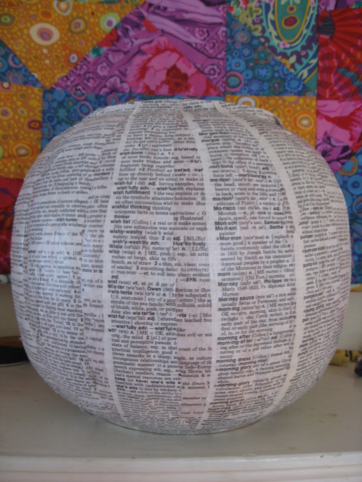 I got this idea from Cloth Paper Scissors's Sept./Oct. 2010 issue -- gluing printed text onto a plastic pumpkin. I "borrowed" one of the Beadboys' pumpkin containers we use for trick-or-treating (after promising repeatedly to buy a new one before Halloween) and pasted on strips cut from dictionary pages (thinner than other printed pages):